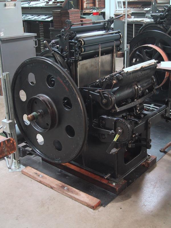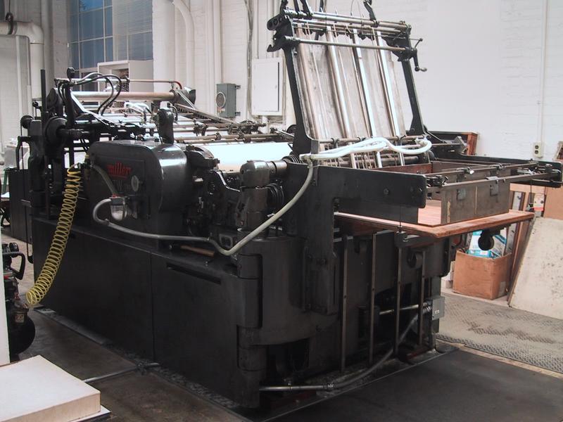 Our Miller TW, the largest press we have. Paradise Lost was printed on this. This is a two-color press, with two impression rollers, two beds, and two fountains. Note the Rube-Goldberg-style powder-spraying mechanism. | |