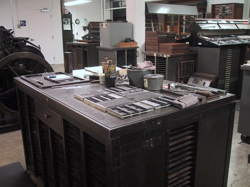 We have many many many cases of type, some of which came from the Grabhorn Press, others from Mackenzie & Harris. The trim saw, which we use to cut slugs and undercut (kern) characters, sits in the back. | |