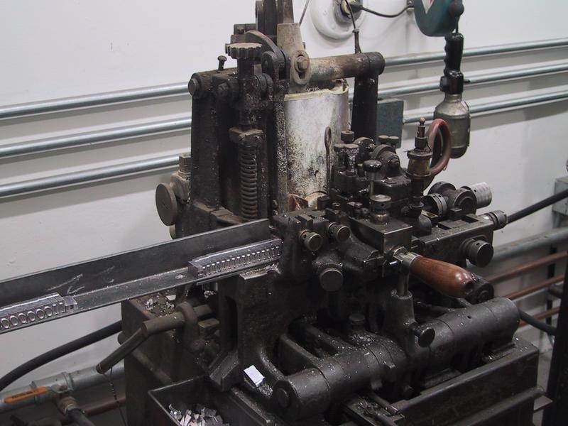 We have six complete Thompson casters, one of which dates back to the beginning of Mackenzie & Harris (then known as the Monotype Composition Company) in 1915. The chart hanging from the pipe indicates point to inch conversions. | |