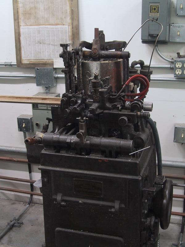 This Thompson caster is configured for casting 24 point type. The red lines are for water to cool the mold; The bare wire going into the pot is attached to a defunct thermocouple/thermostat assembly. Note the font character count chart on the wall. | |