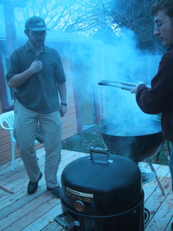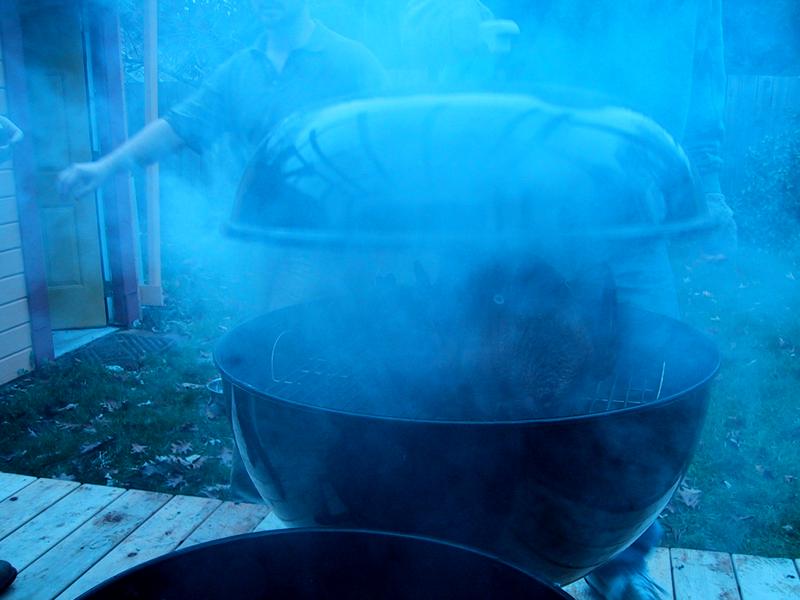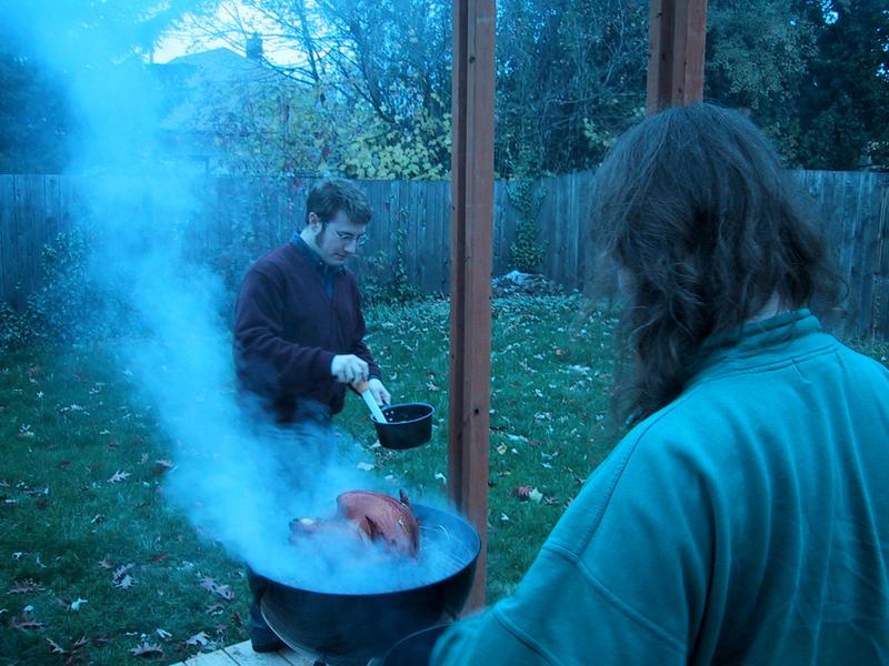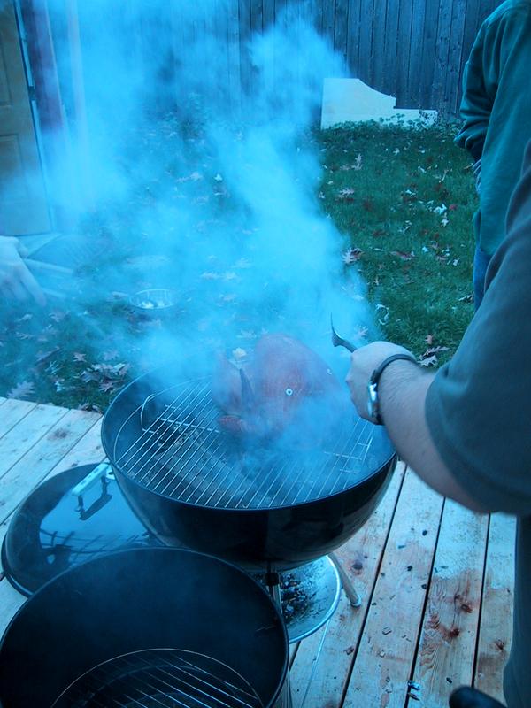Mike and Jamie, smoke, and basting, with the bird on the grill. | |