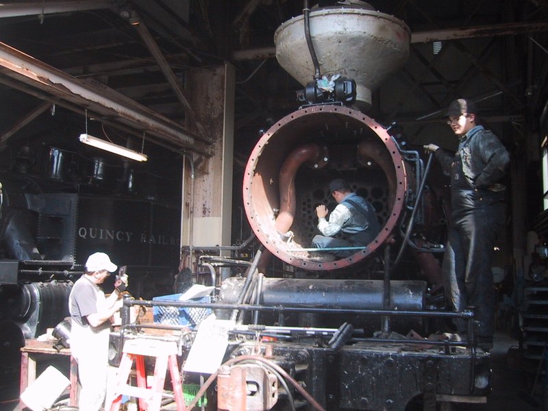 Gerald Dewitt and compatriots helping with a boiler retube on #3. I think Gerald is hand-fitting a newly-machined part. | |
